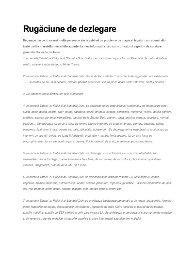 Rugăciune de dezlegare la blestem (letrină două rânduri) îndurate doamne, bunule şi iubitorule de oameni, care pentru îndurările tale ai trimis pe unul‑născut fiul tău în lume, ca să rupă zapisul greşealelor cel asupra noastră şi să dezlege legăturile celor legaţi de păcate şi să propovăduiască celor robiţi iertare, tu, stăpâne, şi pe robul tău (n) liberează‑l. Stăpâne doamne, iisuse hristoase, dumnezeul nostru, creatorule și chivernisitorule a toate, sfânt și slăvit ești; Împăratul împăraților și domnul domnilor, slavă ție! Se spune că cei slabi de înger sunt loviți de acestea.Farmecele și blestemele există, după spusele anumitor persoane.