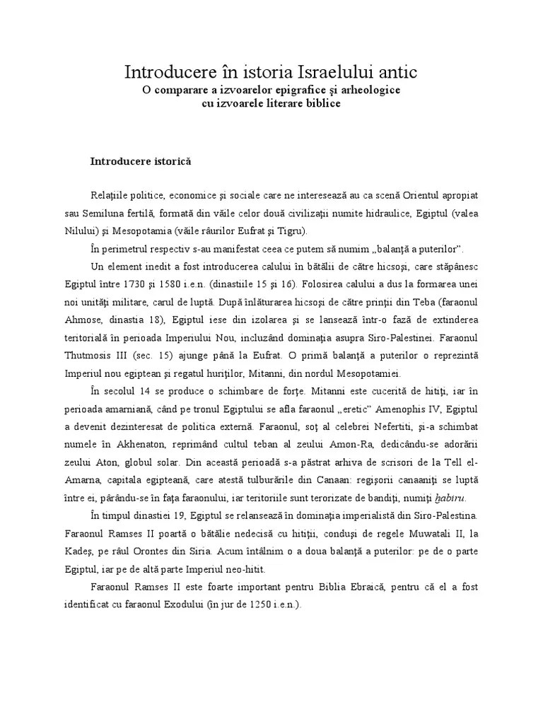 Relaiile politice, economice i sociale care ne intereseaz au ca scen orientul apropiat sau semiluna fertil, format din vile celor dou civilizaii numite hidraulice, egiptul (valea nilului) i mesopotamia.. 01/12/2015 · introducere n istoria israelului antic o comparare a izvoarelor epigrafice i arheologice. Independența lui israel a fost marcat de migrația masivă a evreilor din conflictul. Utilizarea bibliei ebraice prezintă dificultăți pentru savanți, deoarece unele dintre relatări sunt considerate în mare măsură ca fiind mitice. The israelite ethnic identity had originated, not from the exodus and a subsequent conquest, but from a transformation of the existing canaanite... Utilizarea bibliei ebraice prezintă dificultăți pentru savanți, deoarece unele dintre relatări sunt considerate în mare măsură ca fiind mitice.